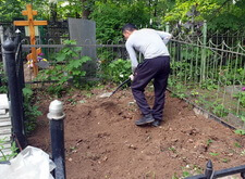 Приехав вновь на кладбище, мы взялись за очистку места захоронения от посторонних элементов: срезали болгаркой старое ограждение; пропололи сорную траву, а также разровняли землю, готовя её к покрытию бетонной плиткой.